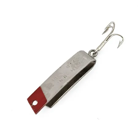 Nikelio apdaila su raudonų dažų akcentu priekinėje dalyje iškart leidžia atpažinti šį klasikinį U formos metalinį masalą iš JAV. 2,3 g svorio ir 3 cm ilgio „South Bend Super-Duper 501“ reprezentuoja išskirtinį minimalistinio žūklės įrankių dizaino laikotarpį. Korpusas pagamintas iš vienos metalo juostelės, sulenktos per pusę, kas sukuria siaurą profilį, išliekantį stabilų traukimo metu. Ant šono išspaustas užrašas aiškiai nurodo prekės ženklą ir modelį, suteikdamas tiesioginį ryšį su jo kilme. Vienas trišakis kablys pritvirtintas prie galinės kilpos per žiedelį, išlaikant originalią konstrukciją. Įvertintas 5/5 balais, šis egzempliorius pasižymi blizgiu paviršiumi, o raudonas akcentas išlieka ryškus ir aiškus, be žymių nusidėvėjimo ženklų. Šis konkretus gaminys, kurio prekės kodas 15315, yra tikra retenybė kolekcininkams, besidomintiems vidurio amžiaus JAV metaliniais masalais.
