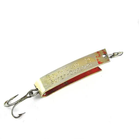Ant auksuoto metalo išspaustas užrašas „SOUTH BEND SUPER-DUPER 502“ žymi šį gaminį kaip klasikinį XX a. vidurio žūklės įrankių pavyzdį. 3 cm ilgio ir 2,5 g svorio masalas pasižymi savita U formos konstrukcija, leidžiančia jam veikti kaip vartiklės ir sukriukės hibridui. Išorinis paviršius padengtas šviesą atspindinčiu auksu, o vidinė išlinkimo dalis nudažyta ryškiai raudona spalva. Kitoje pusėje aiškiai įskaitoma originali patento informacija „PAT. NO. 2 713 378“, tiesiogiai susiejanti masalą su „South Bend“ prekės ženklo inžinerine istorija. Įvertintas 4 iš 5 balų, šis egzempliorius išlaikė ryškią spalvą ir konstrukcinį vientisumą, rodydamas tik nedidelius amžiaus ženklus. Furnitūra atitinka laikmetį: galinėje dalyje sumontuotas tvirtas trišakis kablys, o priekyje – funkcionalus suktukas su segtuku. Šis konkretus modelis (prekės kodas 17827) yra puikus pasirinkimas žvejams, lengvos klasės įrankiais gaudantiems upėtakius ar ešerius.