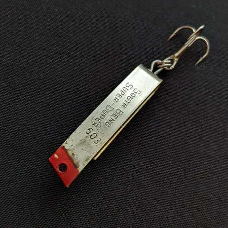 Ant nikelio dangos išspaustas žymėjimas patvirtina, kad tai South Bend Super-Duper 503 – klasikinė amerikietiška upėtakių blizgė. Šis konkretus pavyzdys, kurio prekės kodas yra 18868, pasižymi trijų spalvų – nikelio, aukso ir raudonos – deriniu, kur raudonas akcentas yra prie pat kilpelės valui tvirtinti. 3,5 cm (1 1/2") ilgio ir 4,3 g (1/8 oz) svorio unikali „U“ formos konstrukcija sukurta taip, kad puikiai „kabintų“ vandenį, todėl tai universalus pasirinkimas tiek spiningavimui, tiek velkiavimui su plonu valu. Vidinėje sulenkimo pusėje aiškiai matomas „PAT. PEND'G“ antspaudas, primenantis prekės ženklo vidurio amžiaus gamybos istoriją JAV. Furnitūrą sudaro vienas trišakis kablys, pritvirtintas jungiamuoju žiedeliu prie metalinio korpuso sulenkimo. Būklė vertinama 4/5, metaliniai paviršiai turi nedidelių naudojimo žymių, kurios suteikia charakterio, bet negadina bendros išvaizdos. Nors šis modelis plačiai žinomas kaip pagrindinis masalas upėtakiams, žvejai jį dažnai naudoja ešerių ir lydekų žūklei gėluose vandenyse.