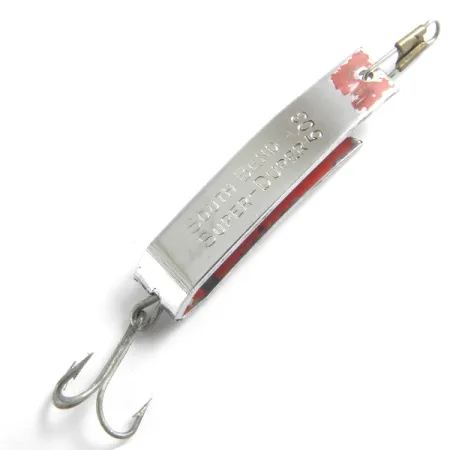 Ant nikiliuoto šio specializuoto metalinio masalo paviršiaus išspaustas „South Bend Super-Duper 503“ pavadinimas, o išskirtinis U formos išlinkimas pavertė šį modelį klasika vidurio amžiaus žvejybos dėžutėse. Sveriantis 4,3 g (1/8 oz) ir būdamas 3,5 cm (1 1/2") ilgio, šis masalas yra pritaikytas spiningavimui lengvais įrankiais ir velčiavimui. Nikiliuotą paviršių papildo raudoni dažai ties tvirtinimo kilpele, matomi nedideli naudojimo pėdsakai, būdingi autentiškam vintažiniam gaminiui. Būklė vertinama 4 balais iš 5, metalas išlaikęs ryškų blizgesį su tik nežymiais paviršiaus įbrėžimais. Masalas komplektuojamas su standartiniu gamykliniu trišakiu kabliuku ir žalvario spalvos tvirtinimo detale. Vidinėje sulenkimo pusėje aiškiai įskaitomas originalus patento numeris, patvirtinantis, kad tai tikras JAV pagamintas „South Bend“ gaminys.