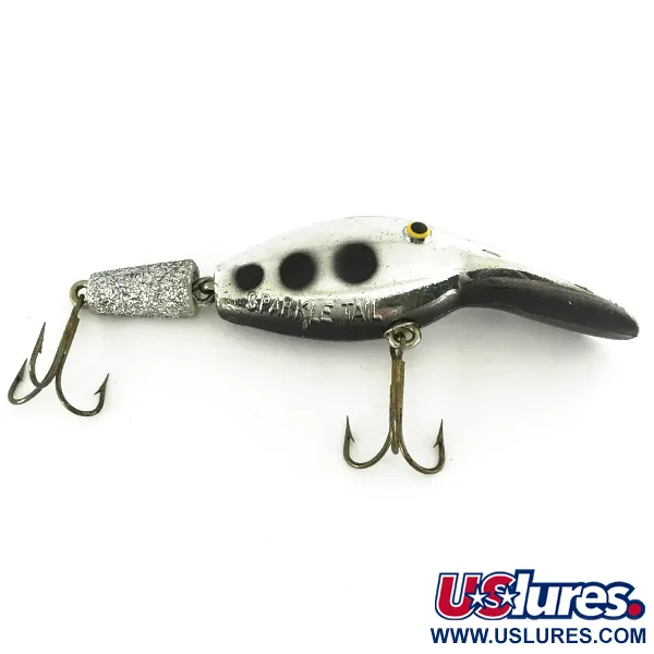 Sidabravimas suteikia šiam 8 cm nariuotam vobleriui klasikinį atspindį, kuris pagauna šviesą bet kokiu kampu. Šis Eppinger Sparkle Tail, žymimas produkto kodu 7223, pasižymi išskirtine blizgučiais padengta galine dalimi, kuri išskiria jį iš to meto standartinių masalų. Kūną akcentuoja trys ryškūs juodi taškai šone, esantys tiesiai virš įspausto modelio pavadinimo „SPARKLE TAIL“. 10 g svorio masalas susideda iš dviejų segmentų, sujungtų tvirtu metaliniu lankstu, ir turi liežuvėlį, skirtą plaukiančiam-neriančiam pateikimui. Sidabrinė apdaila puikiai išsilaikiusi (būklė 5/5), nors originalūs pilvo ir uodegos trišakiai kabliukai turi būdingą senoviniam plienui tamsėjimą. Geltonos akys su mažais juodais vyzdžiais yra ryškiai matomos priekinėje dalyje, sudarydamos orientacinį tašką metaliniame profilyje. Šis JAV pagamintas masalas pasižymi plūdrumu pagrįsta konstrukcija, skirta spiningavimui arba velkiavimui.