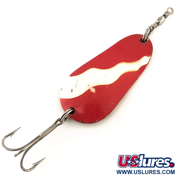 Ši kompaktiška 1/2 uncijos (14 g) svorio ir 1 3/4 colio (4,5 cm) ilgio „Pecos River Tackle Co.“ vartiklė pasižymi klasikiniu Naujojo Meksiko dizainu. Priekinė pusė padengta ryškiu raudonu emaliu, kurį akcentuoja išskirtinė balta banguota juosta, einanti įstrižai per korpusą. Kita pusė yra poliruoto vario paviršiaus, ant kurio aiškiai įspaustas modelio pavadinimas „Spinno-King 0“. Užregistruota produkto kodu 11779, konstrukcija apima viršuje sumontuotą suktuką ir aštrų trišakį kabliuką, abu pritvirtintus tvirtais žiedeliais. Būklė vertinama 5/5, išlaikant puikų spalvų sodrumą dažytoje pusėje ir ryškų atspindį ant varinės nugarėlės. Įranga yra visiškai nepažeista ir tinkama tiek spiningavimui, tiek velkiavimui.