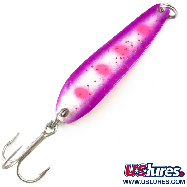 Ši 5 g (3/16oz) „Advance Tackle“ velčiavimo blizgė pasižymi klasikinė kalto vario apdaila kitoje pusėje. Priekinis paviršius pereina iš ryškių purpurinių kraštų į švarų baltą centrą, papuoštą keturiais ryškiais rožiniais taškais ir subtiliu raudonų blizgučių sluoksniu. 5,5 cm (2 1/4") ilgio, JAV pagaminta „Stinger Scorpio“ (produkto kodas 4282) turi pavadinimą ir Mičigano kilmę, išspaustą tiesiai ant korio rašto vario dangos. Šis konkretus pavyzdys yra 5/5 būklės, išlaikęs pilną blizgesį metalinėje pusėje ir ryškų dažytos pusės apibrėžtumą. Įranga sukomplektuota su aštriu trišakiu kabliu ir dvigubais žiedeliais, pritaikytais velčiavimui, kur geriausiai veikia kontrastas tarp ryškios spalvos ir šilto vario žvilgesio. Siauras, pailgas profilis būdingas XX a. pabaigos Didžiųjų ežerų velčiavimo masalams, skirtiems upėtakių ir lašišų žvejybai.