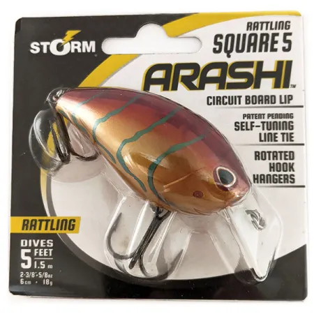 Šis „Storm Arashi Rattling Square 5“ korpusas, padengtas ryškiu „Rusty Craw“ raštu, pasižymi aiškiomis žaliomis vertikaliomis juostomis metaliniame vario-bronzos fone. 18 g (2/3 oz) svorio ir 6 cm (2 1/4") ilgio vobleris turi ploną montažinės plokštės liežuvėlį, kuris padeda efektyviai pasiekti 1,5 m (5 pėdų) panirimo gylį. Konstrukcijoje naudojami VMC kabliukai ant pasuktų kilpų, todėl jų geluonys priglunda arčiau pilvelio – tai sumažina kliuvinių tikimybę ir leidžia naudoti didesnius kabliukus. Į dizainą integruota savaime susireguliuojanti kilpelė valui rišti, todėl masalas išlaiko tiesią trajektoriją be papildomo derinimo. Identifikuotas prekės kodu 11709, šis egzempliorius yra nenaudotas ir pateikiamas originalioje pakuotėje. Didelis plūdrumas leidžia masalui pakilti virš kliūčių, o tai puikiai dera su kvadratinio liežuvėlio forma, skirta atsimušti į kietas kliūtis. Indonezijoje pagaminta vidinė tarškėjimo sistema skleidžia išskirtinį garsą, tinkamą tiek spiningavimui, tiek velkiavimui.