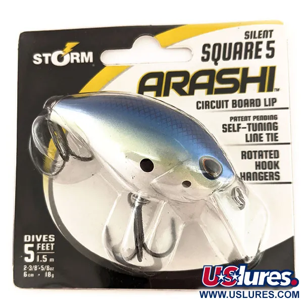 Plonas plokštės (circuit board) liežuvėlis išskiria šį Storm Arashi Silent Square 5 voblerį, sukurtą greitai pasiekti 1,5 m (5 pėdų) panirimo gylį net ir lėtai traukiant. 18 g (2/3 oz) svorio masalas turi patentuotą „Self-Tuning Line Tie“ sistemą – laisvai judančią kilpelę, užtikrinančią tiesią eigą be papildomo reguliavimo. Spalvinė gama yra tiksli smulkios žuvelės imitacija: metalinė mėlyna nugara pereina į sidabrinius žvynus ir blyškų pilvą, papuoštą ryškia juoda dėme šone. 6 cm (2 1/4 colio) ilgio korpuse sumontuotos pasuktos kabliukų kilpos, kurios pritraukia VMC kabliukus arčiau kūno, taip sumažindamos kliuvinių tikimybę. Šis egzempliorius turi produkto kodą 11707, yra nenaudotas ir pateikiamas originalioje 2013 m. pakuotėje. Pagamintas Indonezijoje „Rapala VMC Corp“ užsakymu, šis modelis pasižymi tyliu darbu – jame nėra vidinių barškučių, todėl jis idealiai tinka atsargioms žuvims skaidriame ar stipriai žvejojamame vandenyje.