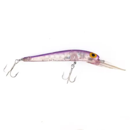 Ryški Purple / Rainbow Silver apdaila apibūdina šį vintažinį radinį, demonstruojantį klasikinį permatomą korpusą ir vidinę foliją, kurią Storm ištobulino USA. Sukurtas pasiekti 2–4 m gylį, skaidrus, pailgas liežuvėlis yra Deep Thunder Stick serijos skiriamasis ženklas. 9 cm ilgio ir 8,8 g svorio šis egzempliorius pažymėtas prekės kodu 10918. Išorė išlieka 5/5 būklės, o ryškios geltonos akys su juodais vyzdžiais atrodo taip pat aštriai, kaip ir tą dieną, kai išriedėjo iš gamyklos. Rekomenduojamas spiningavimui, tvičingui ar velkiavimui, ypač starkių žvejybai, šis plaukiantis vobleris turi aiškiai matomą „Deep Thunder Stick“ antspaudą apatinėje dalyje. Furnitūrą sudaro du originalūs trišakiai kabliukai, išlaikę puikią vintažinio masalo kokybę.