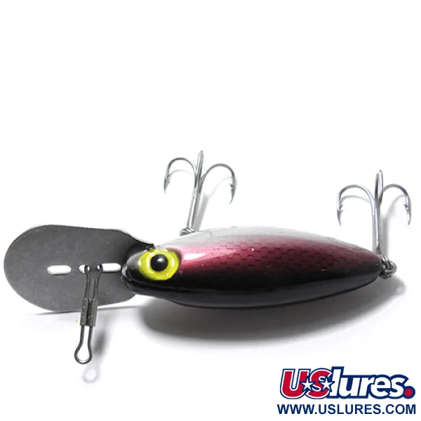 Šis 9 cm (3 1/2") modelis pasiekia 1,5–4 m (5–13 pėdų) gylį dėl išraiškingo metalinio liežuvėlio. Storm Hot'N'Tot Thin Fin, pažymėtas kodu 0043, pasižymi klasikiniu Dark Red / Steel / Black spalvinimu: sodri metalinio raudonumo nugara pereina į sidabrinius šonus su įspaustu korio rašto žvynelių raštu. 12 g (2/5 oz) svoris užtikrina reikiamą masę efektyviam mėtymui, velkiavimui ar dreifavimui gaudant starkius, ešerius ir lydekas. Ryškiai geltonos akys su juodais vyzdžiais nustumtos į priekį, suteikiant aiškų taikinį plėšrūnui. Voblerio būklė vertinama 5/5, originalus dažymas ir furnitūra išlaikyta puikiai. Du trišakiai kabliukai pritvirtinti standartiniais žiedeliais.