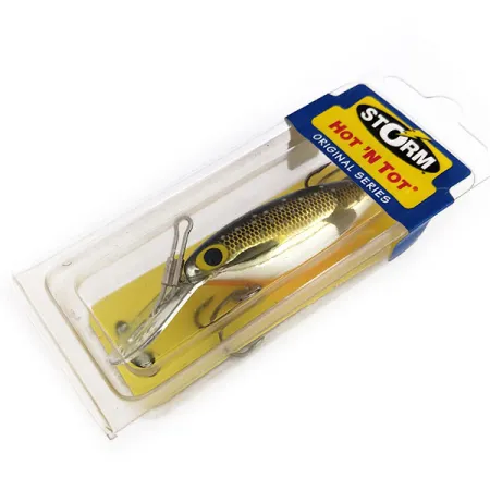 Blizgantys auksiniai žvynai ir kontrastinga juoda nugara apibūdina šio 6,5 g (1/4 oz) voblerio vizualinį profilį. Žymimas prekės kodu 9876, „Storm Original Hot 'N Tot“ išlieka pagrindiniu pasirinkimu žvejams, viliojantiems žuvį velkiavimo ar dreifavimo būdu. Šis 5 cm (2") masalas pasižymi išskirtiniu metaliniu liežuvėliu, kuris leidžia vobleriui stabiliai dirbti net ir neramiame vandenyje. Kolekcionieriai įvertins tai, kad masalas yra nenaudotas ir išlikęs originalioje pakuotėje, išlaikant gamyklinę apdailą bei furnitūrą. „Original Series“ žymėjimas ant mėlynai geltonos kortelės patvirtina jo kilmę iš JAV gamybos eros. Ryškiai geltona akis sukuria ryškų akcentą metaliniame auksiniame šone.