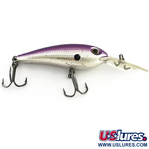 Violetinis nugaros šešėliavimas pereina į tekstūrinį sidabrinį žvynelių raštą ant šio „Storm ThunderCrank MadFlash“ voblerio, žymimo produkto kodu 9107. 6 cm (2 1/4") ilgio ir 10 g (1/3 oz) svorio masalas turi ryškų, pailgintą skaidrų liežuvėlį, skirtą pasiekti iki 5 m (16,4 pėdų) gylį. „Purple Shad“ apdailą pabrėžia ryški juoda dėmė ant peties ir dideli, tamsūs vyzdžiai, sukuriantys fokuso tašką blyškios galvos fone. Konstrukciją sudaro originali furnitūra su dviem aštriais trišakiais kabliukais, patikimai pritvirtintais per žiedelius. Pavadėlio kilpa yra tiesiai ant liežuvėlio – tai techninis to laikmečio giliai nardančių „crankbait“ tipo voblerių bruožas. Bendras egzemplioriaus stovis yra labai aukštos kokybės, įvertintas 4/5, matomi tik minimalūs naudojimo požymiai, būdingi prižiūrimam žvejybos dėžutės turiniui. „MadFlash“ serija lengvai atpažįstama iš vidinės šviesą atspindinčios apdailos, sukurtos gaudyti šviesą giliuose vandens sluoksniuose.
