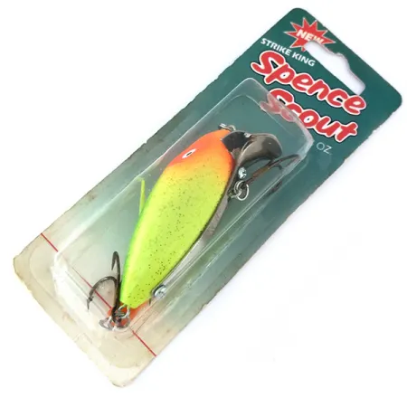 Ryški 245-10 spalvų gama – derinanti ryškiai geltoną kūnelį su šiltai oranžine galva – apibūdina šio 10,5 g (3/8 oz) Strike King Spence Scout išvaizdą. Šis vis dar originalioje vintažinėje pakuotėje esantis egzempliorius yra nenaudotas, todėl ant 6,5 cm (2 1/2") kūnelio išliko gamyklinis blizgus paviršius. Ant pakuotės nurodytas produkto kodas 11145 rodo, kad masalas pagamintas Kosta Rikoje ir komplektuojamas su Eagle Claw Lazer Sharp kabliukais. Šis garsinis plaukiantis modelis skirtas sekliam, 0,3–0,9 m (1-3 ft) nardymo gyliui. Ties nosimi pritvirtintas tvirtas metalinis liežuvėlis, užfiksuotas klasikine sraigtine kilpa, kuri matoma per skaidrų plastiką.