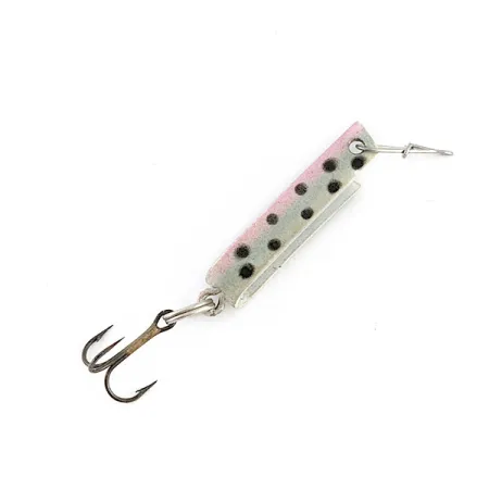 Tiksliai 2,5 cm (1") ilgio, išskirtinis U formos „Super-Duper 500“ korpusas yra „Luhr Jensen“ dizaino paveldo simbolis. Šis konkretus egzempliorius, pažymėtas prekės kodu 23338, išsiskiria klasikinio vaivorykštinio upėtakio spalvinimu su smulkiais juodais taškeliais ant rausvo ir šviesiai žalio gradiento. Masalo būklė yra puiki, įvertinta 5/5, o originalios spalvos išsilaikiusios nepriekaištingai. Sveriantis vos 1,4 g (3/64 oz), lenktas metalinis korpusas sukurtas taip, kad tolygiai traukiant aktyviai dirbtų vandenyje. Jame sumontuotas trišakis kablys, pritvirtintas mažu žiedeliu, o priekinėje kilpelėje yra metalinis segtukas greitam tvirtinimui. Upėtakių žvejų bendruomenėje žinomas kaip „Amerikos masalas“, šis JAV pagamintas įrankis yra universalus pasirinkimas gaudant ešerinius, basus ar lašišines žuvis vietiniuose vandenyse.