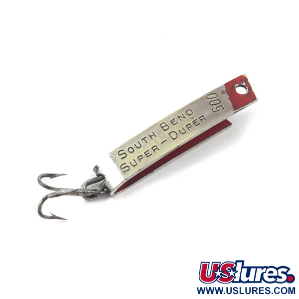 Ant atspindinčio nikelio korpuso aiškiai įspaustas „SOUTH BEND SUPER-DUPER 500“ identifikatorius – šio kultinio JAV gaminto masalo ženklas. 2,5 cm (1 colio) ilgio unikalus U formos metalinis rėmelis turi ryškiai raudoną akcentą priekinėje dalyje, sukuriantį aštrų vizualinį kontrastą su sidabrine apdaila. Šis vos 1,4 g (3/64 oz) sveriantis lengvas egzempliorius skirtas „ultra-light“ spiningavimui arba lėtam velkiavimui. Konstrukcijoje naudojamas nedidelis trišakis kabliukas, pritvirtintas tiesiai per skylę metalo sulenkime. Šis JAV pagamintas kūrinys, kurio prekės kodas 2634, yra puikiai išsilaikiusios 4/5 būklės, išlaikantis švarias linijas ir aiškų spaudą, kuriais garsėjo „South Bend“.