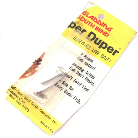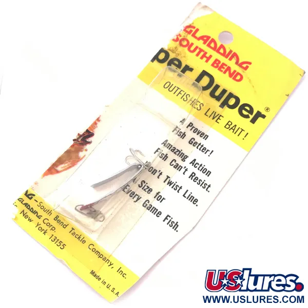Poliruoti nikelio paviršiai su ryškiai raudonu galiuku apibūdina šį 2,5 cm (1 colio) South Bend Super-Duper 500 – mažytį U formos metalinį masalą. Tik 1,4 g (3/64 unc.) sveriantis egzempliorius išliko nenaudotas originalioje Gladding-South Bend Tackle Company pakuotėje su prekės kodu 3930. Konstrukciją sudaro viena sulenkto metalo dalis, sukurta derinti vartiklės ir sukrės savybes. Pagaminta JAV, senovinė geltona kortelė papuošta to laikotarpio grafika ir teiginiu, kad šis masalas „gaudo geriau nei gyvas jaukas“. Masalas turi mažą trišakį kabliuką, pritvirtintą prie lenkto korpuso galo, esantį originaliame skaidraus plastiko dėkle.