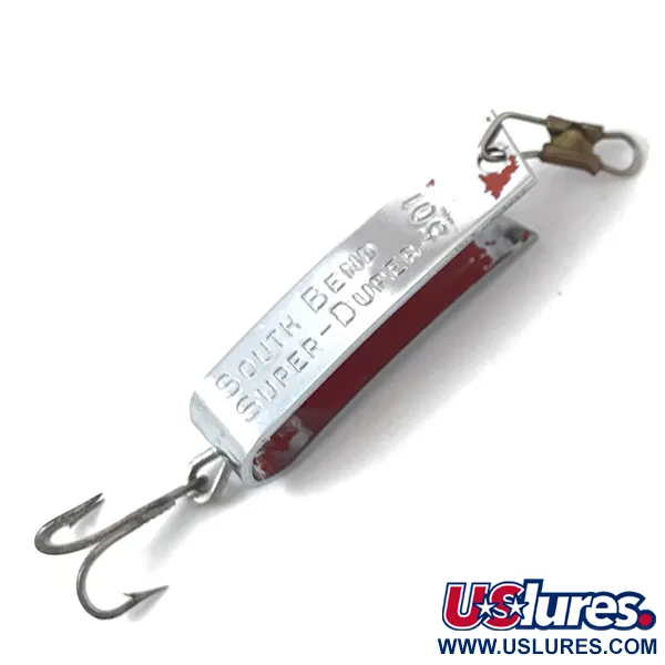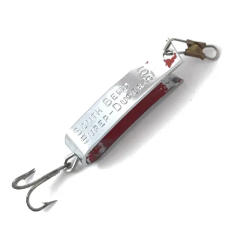 Ant nikeliuoto metalo paviršiaus aiškiai įspaustas užrašas „SOUTH BEND SUPER-DUPER 501“, žymintis klasikinę vidurio amžiaus JAV žvejybos įrankių naujovę. Šis 3 cm (1 1/4") ilgio ir vos 2,3 g (3/32 oz) sveriantis modelis yra puikus ultra-light serijos pavyzdys. Kitoje pusėje matomas ryškus patento Nr. 2,719,378 įspaudas, kuris saugojo išskirtinę lenktą „U“ formos korpuso konstrukciją. Vidinėje šio linkio dalyje ryškūs raudoni dažai sukuria spalvinį kontrastą su blizgiu nikeliu, matomi tik nedideli paviršiaus nusidėvėjimo požymiai nuo buvimo žvejybos dėžutėje. Įvertinta 5/5 būkle, blizgė išliko su originaliu suktuku ir tvirtu trišakiu kabliuku. Identifikuojama pagal prekės kodą 3829, ši konstrukcija atspindi aukštus gamybos standartus, kurių South Bend laikėsi kurdami savo universalių blizgių liniją.