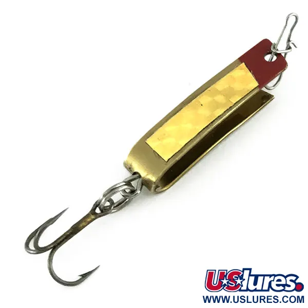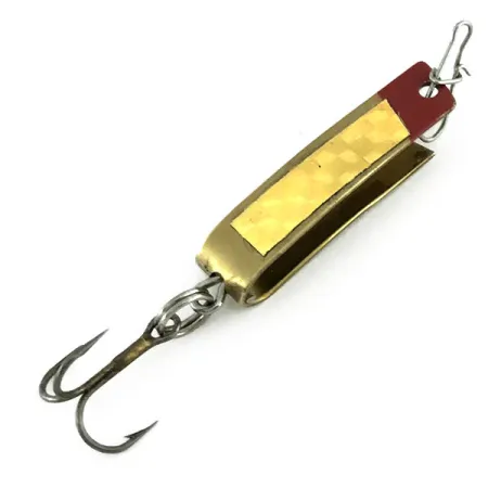 Aukso spalvos danga ir ryškiai raudonas galiukas apibūdina South Bend Super-Duper 501 vizualinį charakterį, žymimą produkto kodu 9537. Šis JAV pagamintas masalas, sveriantis 3/32 oz (2,3 g) ir esantis 1 1/4" (3 cm) ilgio, pasižymi išskirtine U formos lenkto metalo konstrukcija. Vienoje pusėje užklijuota tekstūruota holografinė auksinė juostelė, skirta sustiprinti šviesos atspindžius. Masalas yra 5/5 būklės, švariu paviršiumi, kuriame aiškiai įspaustas prekės ženklo pavadinimas 'SUPER-DUPER'. Masale sumontuotas tvirtas trišakis kablys, pritvirtintas per žiedelį, o galvutėje yra suktukas su segtuku patogiam valo tvirtinimui. Bendras dizainas atspindi unikalų blizgės ir sukrės elementų derinį, būdingą South Bend vidurio amžiaus gamybos stiliui.