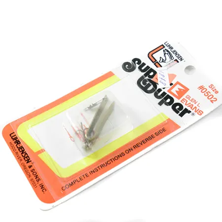 Tiksliai 3 cm (1 1/4") ilgio vintažinė Super-Duper blisgė pateikiama originalioje Glen L. Evans eros pakuotėje. Žalvario apdaila derinama su ryškia raudona galvute – tai klasikinė spalvų kombinacija, nurodyta kitoje pusėje kaip „BRSS/RED HEAD“ (užsakymo Nr. 1303-502-131). Šis 2,5 g (3/32 oz) svorio masalas, kurio produkto kodas 1878, pasižymi kultiniu U formos metaliniu korpusu, dėl kurio Luhr Jensen linija tapo nepakeičiama upėtakių ir ešerių žvejams dar nuo tų laikų, kai įmonė veikė Hood River, Oregone. Originalioje pakuotėje yra specialus suktukas su apvalia ausele, kurio taisyklingą montavimą pabrėžia instrukcijos, kad nebūtų pakenkta numatytam masalo darbui. Šis egzempliorius nenaudotas, išlaikęs gamyklinę išvaizdą, būklė vertinama 6 balais. Pakuotės dizainas atspindi pereinamąjį laikotarpį, kai Luhr Jensen perėmė Glen L. Evans prekės ženklą, išlaikydama aukštus JAV gaminamų žūklės įrankių standartus iš Ramiojo vandenyno šiaurės vakarų.