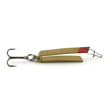 Tiksliai 1 1/4 colio (3 cm) ilgio, išskirtinis šio egzemplioriaus U formos profilis leidžia jį atpažinti kaip tikrą metalinių masalų pasaulio klasiką. Šis konkretus modelis, žymimas prekės kodu 5952, pasižymi blizgia aukso spalvos apdaila su ryškiu raudonu akcentu ties valo tvirtinimo vieta. Ant viršutinės metalinės dalies aiškiai išspaustas SUPER-DUPER pavadinimas kartu su skaičiumi 502 ir kilmės šalimi – USA. Sverdama 3/32 uncijos (2,5 g), ši blizgė skirta lengvosios žūklės entuziastams. Masalas yra išskirtinės būklės (vertinamas 5/5), paviršiai puikiai išsilaikę, kaip ir dera vertingam kolekciniam egzemplioriui. Blizgė sukomplektuota su aštriu trišakiu kabliu, pritvirtintu per tvirtą žiedelį galinėje dalyje, o prie raudonai nudažyto priekio jau pritvirtintas metalinis segtukas. South Bend sukurtas 502 modelio dizainas naudoja paprastą, bet efektyvų sulenkto metalo korpusą, kuris tapo ikonišku nuo pat jo pasirodymo.