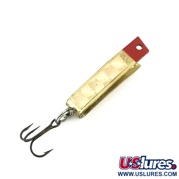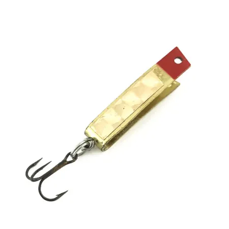 Šis 1 1/4 colio (3 cm) ilgio South Bend pavyzdys pasižymi išskirtine sulenkto metalo U formos konstrukcija, būdinga Super Duper 502 modeliui. Paauksuota išorė dekoruota tekstūruotu, į deimantą panašiu briaunotu raštu, kurį papildo vientisas raudonas akcentas ties kilpele. Šis 3/32 oz (2,5 g) masalas, atpažįstamas pagal produkto kodą 8616, sujungia blizgės ir sukrės savybes viename kompaktiškame profilyje. Žalvarinio korpuso kitoje pusėje aiškiai įspaustas užrašas „PAT NO 2,710,478“, atspindintis istorinę gamybos kilmę JAV. Išlaikęs visą pirminį blizgesį, šis pavyzdys yra 5/5 būklės su švaria furnitūra ir aštriu trišakiu kabliuku, pritvirtintu žiedeliu.