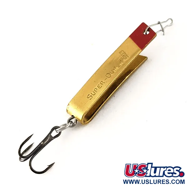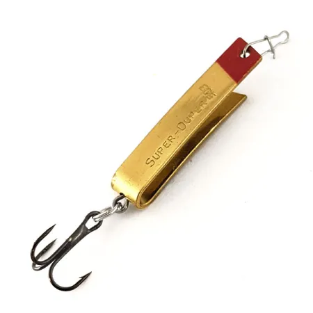 Auksuotas paviršius su ryškiu raudonu galiuku apibūdina šią South Bend klasiką, pažymėtą prekės kodu 12420. Ši 3,5 cm (1 1/2") ilgio ir 4,3 g (1/8 oz) svorio Super-Duper 503 blizgė yra sumanios XX a. vidurio JAV inžinerijos įrodymas. U formos metaliniame korpuse vienoje pusėje aiškiai išspaustas modelio pavadinimas, o kitoje – originalus patento numeris 2,713,228. Šis konkretus pavyzdys išlaikė išskirtinę išvaizdą, įvertintą 5/5 balais dėl ryškaus blizgesio ir puikiai išsilaikiusių dažų. Tamsintas trišakis kabliukas pritvirtintas prie apatinio linkio per mažą žiedelį, o viršutinėje tvirtinimo vietoje yra senovinis suktukas su segtuku. Šis dizainas garsėjo savo universalumu, derinant blizgės ir sukrės technines savybes, kad priviliotų įvairias gėlavandenes žuvis. Auksinė / Raudona spalvų gama išlieka mėgstama tarp ankstyvosios South Bend įrangos kolekcininkų.