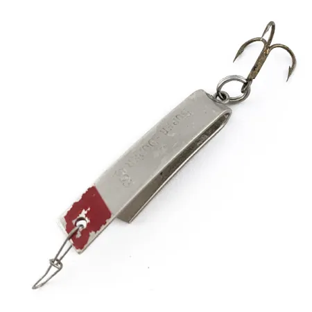 Ši 4,3 g (1/8 oz) Luhr Jensen Super-Duper 503 išsiskiria unikaliu „U“ formos profiliu, kuris yra jos išskirtinio dizaino, skirto efektyviam darbui vandenyje, pagrindas. 3,5 cm (1 1/2 colio) nikelio spalvos korpusas turi aiškiai įspaustą modelio žymėjimą, o prie kilpelės valui tvirtinti yra papuoštas klasikiniais raudonais dažais. Šis JAV pagamintas masalas, pažymėtas prekės kodu 22870, išsaugojo originalų trišakį kabliuką ir priekinį vielinį tvirtinimą. Masalo būklė įvertinta 4/5: matomi nedideli paviršiaus nusidėvėjimo požymiai ant raudonų dažų akcento, tačiau nikelio danga išlieka ryški ir gerai atspindi šviesą. Netradicinė forma yra specialiai sukurta spiningavimui arba velčiavimui naudojant ploną valą, todėl tai yra universalus įrankis gaudant upėtakius ir ešerines žuvis. Išlenkto metalinio rėmo konstrukcija yra puiki, o tai rodo aukštą kokybės kontrolę, būdingą senajai Luhr Jensen žūklės įrangai.