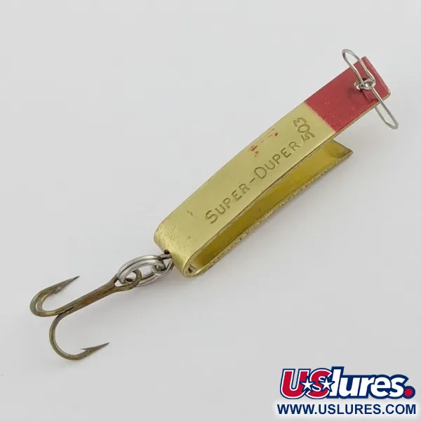 Ryškiai raudonas galiukas sukuria ryškų kontrastą su aukso spalvos šios klasikinės U formos blizgės metalu. Tiesiai ant korpuso išspaustas pavadinimas SUPER-DUPER 503 kartu su patento Nr. 2719378, nurodančiu autentišką Luhr Jensen paveldą. Šis JAV pagamintas egzempliorius pasižymi juodomis raidėmis, kurios išliko ryškios, o tai lemia 5/5 būklę. Netradicinė sulankstyta konstrukcija sukurta taip, kad efektyviai kabintų vandenį velkiaujant arba mėtant su lengvu valu. Yra visa originali furnitūra, įskaitant trišakį kabliuką, pritvirtintą žiedeliu, ir vielinį segtuką valo pusėje. Šis modelis, dažnai randamas aistringų upėtakių ir ešerių žvejų rinkiniuose, yra esminė vidurio amžiaus žvejybos istorijos dalis. Aukso danga išlaiko savo pradinį blizgesį per visą sulankstyto metalinio rėmo ilgį. Ši prekė įtraukta į katalogą produkto kodu 24435.