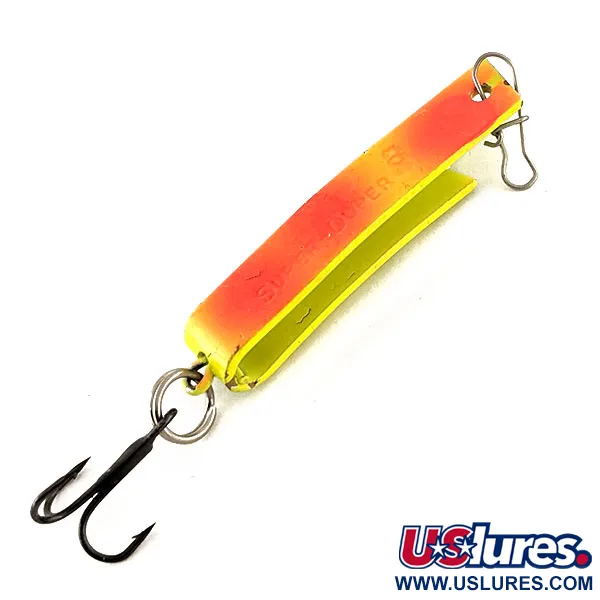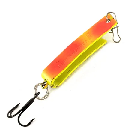 Švytėjimo tamsoje savybės apibūdina šio South Bend Super-Duper 503 UV paviršių, todėl jis yra specializuotas pasirinkimas giliems vandenims arba apsiniaukusioms dienoms. Identifikuojamas pagal prekės kodą 12421, šis masalas pasižymi unikaliu U formos sulenktu metaliniu korpusu, kuris sujungia sukrės ir blizgės savybes. Ryškūs dažai pereina iš šviesaus chartreuzo į sodrią oranžinę spalvą, o UV spinduliams reaktyvi danga užtikrina puikų matomumą prasto apšvietimo sąlygomis. Šis konkretus pavyzdys yra nenaudotas, nepriekaištingos būklės, su originalia gamykline apdaila ir nepažeistais štampuotais ženklinimais. Aštrus juodas trišakis kabliukas pritvirtintas prie uodegos per žiedelį, o galvoje iš anksto sumontuotas segtukas patogiam valo tvirtinimui.