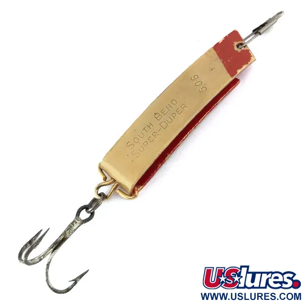 Ant auksinės spalvos metalo aiškiai išspaustas žymėjimas "SOUTH BEND SUPER-DUPER 506" identifikuoja šią išskirtinę U formos blizgę, kataloge žymimą prekės kodu 11024. 4,5 cm (1 3/4") dydžio masalas pasižymi kultiniu raudonos spalvos galvos akcentu blizgiame auksiniame korpuse. 7 g (1/4oz) svorio Super-Duper yra vidurio amžiaus JAV inovacija, suderinanti blizgės ir sukrės savybes gėlavandeniams plėšrūnams vilioti. Vidinėje kreivėje matomas originalus patento spaudas – unikalios šio klasikinio sulenkto metalo masalo inžinerijos ženklas. Furnitūra itin švari, su ryškiu trišakiu kabliuku ir originaliu suktuku. Šis pavyzdys yra 5/5 būklės, išlaikęs blizgią metalo apdailą ir ryškų dažytą kontrastą.