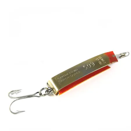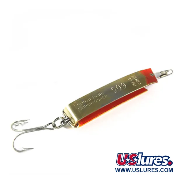 Metale aiškiai įspaustas žymėjimas „South Bend Super-Duper 509“ identifikuoja šią 2 1/4" (5,5 cm) blizgę kaip Amerikos žūklės istorijos dalį. Išskirtinis U formos profilis pasižymi paauksuota išore, kuri kontrastuoja su ryškiai raudonai dažytu vidumi – šis derinys sukurtas matomumui tiek metant, tiek velkiaujant. Šis 11 g (2/5 oz) sveriantis egzempliorius turi vidinį kodą 0507. Būklės įvertinimas 4/5 atspindi tvarkingą išvaizdą: įspaustas tekstas, įskaitant „PAT'D“ ir „USA“, išlieka ryškus ir įskaitomas auksiniame paviršiuje, o raudoni dažai linkio viduje turi nedidelių laikymo žymių. Konstrukciją sudaro sidabrinio atspalvio trišakis kabliukas, pritvirtintas žiedeliu, ir segtukas kitame gale.