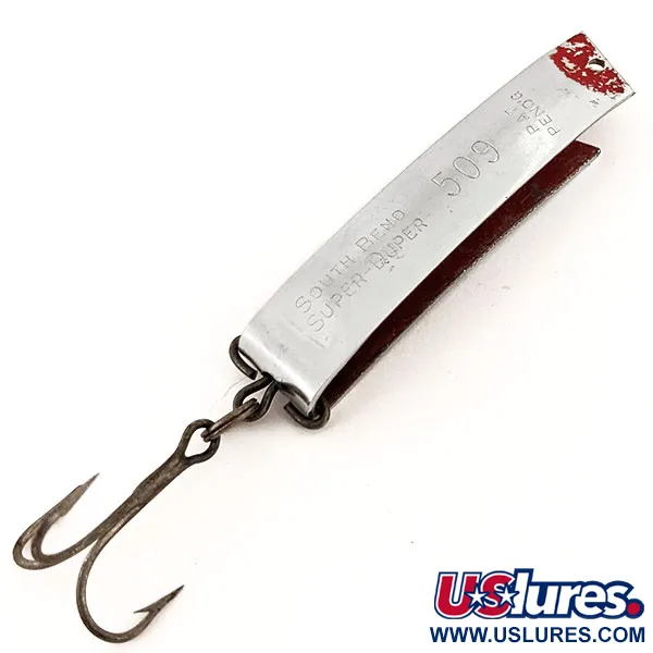 Sunki nikeliuota danga apibūdina šį 11 g (2/5 oz) metalinį masalą, kuris yra klasikinės amerikiečių inžinerijos pavyzdys. Šis South Bend Super-Duper 509, atpažįstamas pagal produkto kodą 13106, pasižymi išskirtiniu U formos korpusu, kurio ilgis – 5,5 cm (2 1/4 colio). Viršutinėje pusėje tiesiai ant metalo aiškiai įspaustas gamintojo ir modelio pavadinimas kartu su „PAT PEND“ žyma. Jo konstrukcija pasižymi tuo, kad viename kompaktiškame rėme derinamos blizgės ir sukrės savybės. Uodegos dalyje raudonai nudažytas akcentas turi šiek tiek naudojimo žymių, o tai atsispindi jo 4/5 būklės vertinime. Masalas komplektuojamas su vienu trišakiu kabliu, pritvirtintu galinėje dalyje, tinkamu tradiciniam spiningavimui ar velkiavimui.