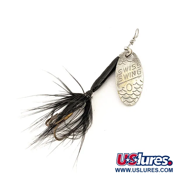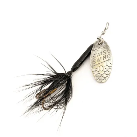 Prancūzija yra šios 1,6 g (1/16oz) sukriukės kilmės šalis, reprezentuojanti klasikinį europietišką požiūrį į itin lengvų masalų dizainą. 4,5 cm (1 3/4") ilgio Renosky Lures Swiss Swing 0 (kodas 12621) išsiskiria štampuotu sidabriniu lapeliu su detalia žvynų tekstūra apatinėje dalyje. Juodas korpusas derinamas su trišakiu kabliuku, papuoštu juodomis plunksnomis, sukuriančiu kontrastingą sidabro ir juodos spalvos derinį. 5/5 būklės metaliniai paviršiai yra ryškūs, o plunksnos išlieka tankios ir tvirtai pritvirtintos. Ant lapelio aiškiai nurodytas modelio pavadinimas ir dydis, jis pritvirtintas prie vielos rėmo tradicine kilpele.
