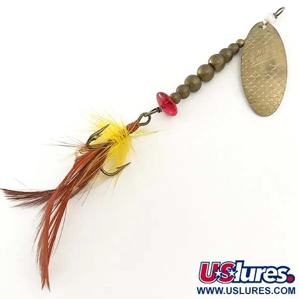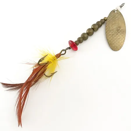 Sustiprinto žalvario karoliukai puošia šios Prancūzijoje pagamintos sukriukės vielinę ašį, suteikdami jai išskirtinį svorio profilį ir klasikinę estetiką. Ovalus žalvarinis lapelis su įspaustu Swiss Swing pavadinimu pasižymi faktūriniu žvynų raštu, suteikiančiu unikalų atspindį. Šis modelis, pažymėtas prekės kodu 6645, sveria 7 g (1/4 oz) ir yra 8,5 cm (3 1/4") ilgio, todėl yra puikus pasirinkimas upėtakių ar ešerių žūklei. Vienas briaunotas raudonas karoliukas tarnauja kaip masalo akcentas tiesiai virš trišakio kabliuko, papuošto geltonos ir rudos spalvos plunksnomis. Mažas baltas karoliukas viršutinėje kilpelėje užtikrina sklandų lankelio sukimąsi tolygiai traukiant masalą. Šis vintažinis masalas yra puikios būklės (įvertinimas 5/5). Metalinės dalys išlieka blizgios, o plunksnų puošmena yra gausi ir tvirtai apvyniota raudonu siūlu.