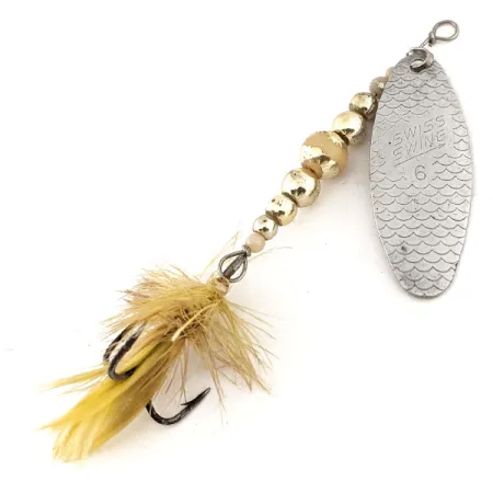 Aiškiai įspaustas tekstūrinis žvynelių raštas ir „SWISS SWING 6“ žyma ant sidabrinio lapelio išduoda, kad tai klasikinė Renosky Lures sukrė. 8 cm (3 1/4") ilgio ir 5 g (3/16 oz) svorio masalas pasižymi kokybiška konstrukcija, būdinga prancūziškiems žūklės reikmenims. Pagrindinį korpusą sudaro eilė graduotų žalvario spalvos karoliukų, suteikiančių reikiamą svorį metimui. Galinėje dalyje trišakis kablys kruopščiai aprištas geltonų ir rusvų plunksnų mišiniu, sukuriančiu švelnų vizualinį profilį, kontrastuojantį su ryškiu sidabriniu metalo paviršiumi. Šis egzempliorius (produkto kodas 12623) yra 4/5 būklės, su nedideliais amžiaus požymiais – smulkiomis paviršiaus žymėmis ant metalinių karoliukų ir lapelio. Sidabruotas ovalus lapelis laikomas tradicinio metalinio lankelio, esančio tiesiai virš karoliukų virtinės ir vielinės kilpelės.