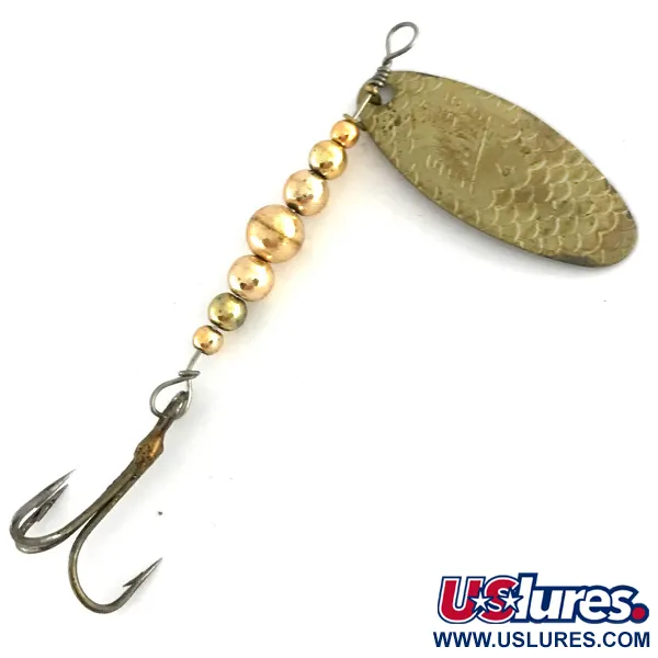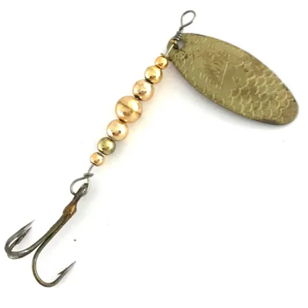 Šeši sugraduoti žalvariniai karoliukai sudaro šios 2,6 g (3/32oz) Renosky Lures sukrės pagrindą. Žinomas kaip Swiss Swing ir identifikuojamas pagal kodą 8455, šis 6 cm (2 1/4") masalas yra kilęs iš Prancūzijos, kas atspindi šalies tradicijas gaminant tikslią žūklės įrangą. Žalvarinis lapelis yra išmuštas smulkiu žvynelių raštu, kuris sukuria ryškų vizualinį kontrastą su poliruotais karoliukais. Tvirtas vielinis korpusas jungia viršutinę kilpelę su bronzos apdailos trišakiu kabliuku uodegoje. Kiekvienas komponentas, nuo svorį suteikiančių karoliukų iki tekstūruoto lapelio, išlaiko vientisą žalvario apdailą. Šis pavyzdys yra 5/5 būklės, atrodo puikiai išsilaikęs ir išsaugojęs originalų metalo blizgesį ant visų paviršių.