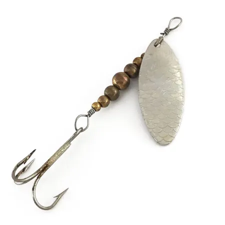 Šios 4 g (1/8 oz) „Renosky Lures Swiss Swing“ sukriukės sidabruoto lapelio paviršiuje išspaustas ryškus žvynų raštas. Šis modelis, pažymėtas prekės kodu 9171, yra 7 cm (2 3/4") bendro ilgio. Korpusas sudarytas iš šešių graduotų žalvarinių karoliukų, kurie suteikia reikiamą svorį metimui ir gylio kontrolei. Trišakis kablys tvirtai pritvirtintas prie galinės vielos kilpos, o tai rodo „Renosky“ būdingą solidžią surinkimo kokybę. Kita lapelio pusė yra lygi ir poliruota, skirta sukurti ryškų blyksnį. Šis egzempliorius yra 5/5 būklės, o vielos apvijos tiek ties viršutine kilpa, tiek ties kablio tvirtinimu išlieka standžios ir saugios. Sidabrinio lapelio tekstūros ir žalvarinių korpuso karoliukų derinys paverčia šį masalą klasikinės konstrukcijos sukriukės pavyzdžiu.