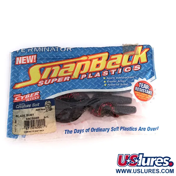 Šie 4 colių (10 cm) minkštieji masalai, pagaminti originaliose JAV gamyklose, žymi svarbią Amerikos džigavimo istorijos erą. Terminator Snapback Creature „Black Ruby“ spalvinimas pasižymi tamsiu, nepermatomu pagrindu su gausiomis raudonų blizgučių priemaišomis, kurios gaudo šviesą per pusiau permatomas masalo detales. Šioje pakuotėje (produkto kodas 9826) yra trys nenaudoti egzemplioriai, išlaikę pradinį elastingumą ir gamyklinę tekstūrą. Konstrukciją sudaro stipriai rumbuotas pagrindinis korpusas, dvi poros besirangančių uodegėlių ir skelta uodega – tokia konfigūracija būdinga „creature“ tipo masalams, skirtiems stipriam vandens stūmimui. Nors Terminator plačiai žinomas dėl savo metalinių masalų, šie silikoniniai gaminiai buvo sukurti specialiai džigavimo technikoms, kurioms reikalingas ypatingas patvarumas. Kiekvienas pakuotės vienetas yra gamyklinės būklės, o jų išlaikymas vertinamas 6 balais.