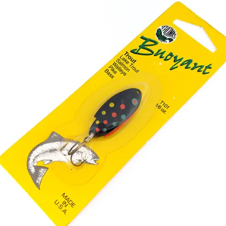 Ryškūs raudoni, geltoni ir žali taškai ant sodriai juodo emalio paviršiaus apibūdina šios 4 cm (1 1/2") blizgės Black Trout raštą. Ši Thomas Buoyant blizgė (kodas T101B) sveria 5 g (3/16 oz) ir yra nepakeičiama žvejojant upėtakius, lašišas ir sterkus. JAV pagamintas masalas turi išskirtinės formos metalinį korpusą, skirtą spiningavimui ar velkiavimui įvairiomis sąlygomis. Furnitūra pritvirtinta per žiedelį, su originaliu aštriu trišakiu kabliuku. Šis egzempliorius yra nenaudotas, gamyklinės būklės, koks ir iškeliavo iš Pensilvanijos gamyklos. Originalioje pakuotėje pateikiamos instrukcijos žvejybai upėse ir ežeruose, rekomenduojant lėtą traukimą, kad masalas tinkamai dirbtų.