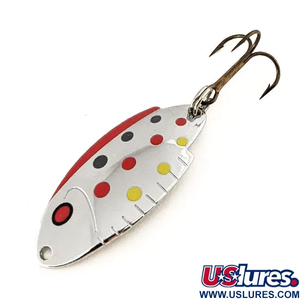 Nikelio danga yra pagrindas klasikiniam raudonų, juodų ir geltonų taškų raštui ant šio 4 cm (1 1/2") masalo paviršiaus. Ši 5 g (3/16 oz) sverianti Thomas Buoyant (prekės kodas 11248) pasižymi tradicine blizgės forma, kuri dešimtmečius formavo Amerikos upėtakių žvejybą. Kitoje pusėje aiškiai matomas gamintojo pavadinimas ir giliai metale įspaustas 'BUOYANT' antspaudas. Ryškus raudonas akcentas atkartoja išorinį išlinkimą, o paviršių papildo stilizuota akis. Trišakis kablys ir furnitūra išlieka blizgūs ir aštrūs, o tai atitinka 5/5 būklę. Šis JAV pagamintas egzempliorius išlaikė aukšto poliravimo blizgesį visame korpuse, o dažai išliko ryškūs ir aiškūs.