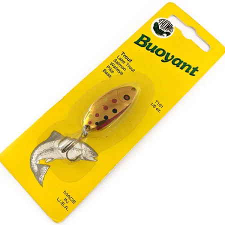 Ši vintažinė Thomas Buoyant blizgė, pasižyminti išskirtiniu Copper Trout raštu su juodais ir raudonais taškeliais ant auksinio pagrindo, yra originalioje vintažinėje pakuotėje. Pagaminta Hawley mieste, Pensilvanijoje, ši 4 cm (1 1/2") blizgė yra klasikinė Amerikos žūklės įrankių istorijos dalis iš Thomas Spinning Lures, Inc. 4,7 g (1/6 oz) svoris daro ją universaliu pasirinkimu gaudant upėtakius, lašišas ir net sterkus įvairiomis vandens sąlygomis. Šis konkretus egzempliorius turi prekės kodą T101B-G ir yra 6-os būklės vertinimo, o tai reiškia, kad jis visiškai nenaudotas ir niekada nematęs vandens. Įrangą sudaro aukštos kokybės trišakis kablys, pritvirtintas tvirtu žiedeliu, būdingu šioms Hawley gamybos blizgėms. Ant geltonos kortelės nugarėlės pateiktos išsamios instrukcijos nurodo, kad masalas yra efektyvus metant skersai srovės upėse arba traukiant skirtinguose gyliuose ežeruose. „MADE IN U.S.A.“ antspaudas apatiniame kairiajame pakuotės kampe liudija ilgą prekės ženklo gamybos tradiciją.