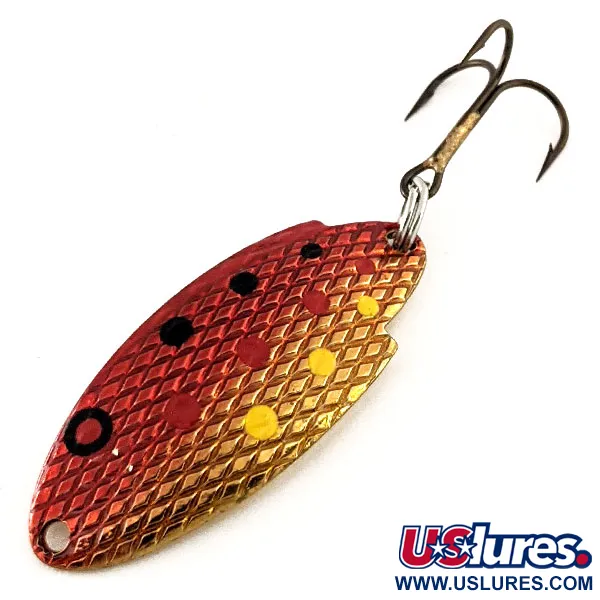 Kalinėta „Rainbow Hammered Red“ paviršiaus tekstūra sukuria daugiamatį blyksėjimą, kuris dešimtmečius garsina Thomas Buoyant seriją. 38 mm (1 1/2") ilgio, išskirtinės kuprotos formos JAV pagaminta blizgė yra nepakeičiama upėtakių ir lašišų žvejų įrankių dėžutėse. Ant poliruotos auksinės nugarėlės išmuštas „THOMAS 1/6 oz BUOYANT“ ženklas, nors šis konkretus pavyzdys kataloguojamas kaip 5,3 g (3/16 oz) svorio su prekės kodu 11696. Viršutinė dalis pasižymi sodriu raudonu gradientu, pereinančiu į auksinę spalvą, dekoruota juodų, raudonų ir geltonų taškų seka. Furnitūra puikios būklės: tvirtas trišakis kabliukas pritvirtintas per patvarų žiedelį. Būklė vertinama 5/5, masalas išlaikęs originalų blizgesį ir ryškias detales.