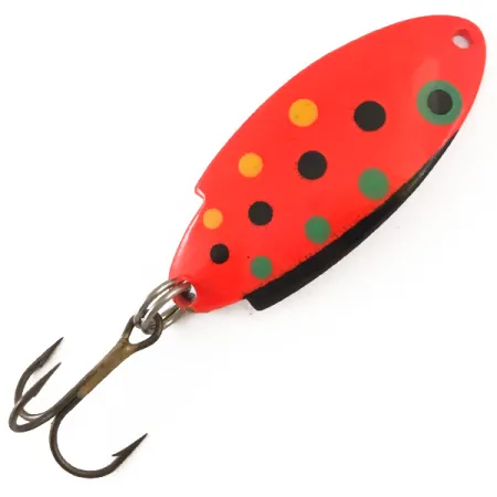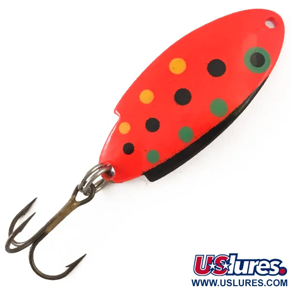 Tiesiai į metalą balto perlo pusėje įspaustas žymėjimas patvirtina, kad šis 3/16 oz (5 g) egzempliorius yra originali JAV pagaminta Thomas Buoyant blizgė. 1 1/2" (4 cm) ilgio blizgė ant savo išgaubto paviršiaus turi ikoninį Red Trout raštą, kurį sudaro geltoni, juodi ir žali taškai ant vientiso raudono pagrindo. Šis konkretus masalas, kurio prekės kodas 4767, yra išsaugotas 5/5 būklės su švaria apdaila tiek pagrindinėje raudonoje pusėje, tiek perlamutrinėje baltoje nugaroje. Thomas šiam modeliui parinko klasikinį lašo formos profilį, kuris čia sukomplektuotas su bronzos apdailos trišakiu kabliuku ir tvirtu žiedeliu. Tokios blizgės tradiciškai naudojamos spiningavimui upeliuose arba velčiavimui ežeruose, kur 5 g svoris suteikia pakankamai masės tiksliems metimams ir gylio kontrolei.