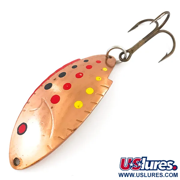 Aiškiai įspaustas ant išlenkto metalinio korpuso nugarėlės, 'THOMAS BUOYANT' ženklas ir 'PAT PEND' žyma identifikuoja šią 6 cm blizgę kaip klasikinę Amerikos žūklės įrankių istorijos dalį. Šiltas varinis pagrindas dekoruotas ryškiais raudonais, juodais ir geltonais taškais – tai klasikinis spalvinis raštas, sukurtas geram matomumui įvairiomis vandens sąlygomis. Ši 14 g sverianti blizgė pasižymi tvirta konstrukcija ir savitomis įrantomis palei vieną kraštą, kurios atkartoja nugarinio peleko siluetą. Masalo furnitūrą sudaro tvirtas žiedelis ir bronzuotas trišakis kablys, abu atrodo struktūriškai patikimi. Būklė vertinama 5/5: priekinė masalo dalis atrodo puikiai, dažai išlikę ryškūs, o nugarėlėje matomos kelios lengvos paviršiaus žymės ir nedidelės senėjimo dėmės, patvirtinančios vintažinį statusą. Šis JAV pagamintas egzempliorius demonstruoja Thomas prekės ženklui būdingus ilgaamžius gamybos standartus.