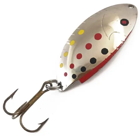 Galinėje dalyje ant poliruoto nikelio paviršiaus aiškiai iškalta žymė „THOMAS BUOYANT 1/2 OZ USA“ patvirtina šios klasikinės amerikietiškos blizgės kilmę. 2 1/4 colio (6 cm) ilgio ir 1/2 uncijos (14 g) svorio masalas pasižymi išskirtiniu lašo formos profiliu su iškiliu peleko elementu, būdingu „Thomas“ prekės ženklui. Paviršius dengtas blizgiu nikeliu, išgaubtoje pusėje dekoruotas tradiciniu raudonų, geltonų ir juodų taškų raštu bei ryškia raudona spalva palei vieną briauną. Šis konkretus masalas, kurio prekės kodas 4959, yra išlaikęs originalų blizgesį, o jo būklė vertinama 5/5. Konstrukciją sudaro tvirtas, bronzuotas trišakis kablys, pritvirtintas per tvirtą žiedelį, tinkamas spiningavimui ar velkiavimui gaudant upėtakius ir lašišas. Smaigėjantį galvutės galą kerta tiksliai išmušta kilpelė valui, užtikrinanti patikimą jungtį su pavadėliu.