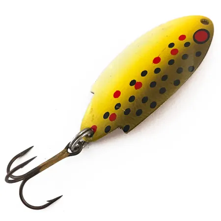 Auksuotoje nugarėlėje aiškiai įspaustas žymėjimas THOMAS T102 BUOYANT 1/4 OZ patvirtina šios klasikinės amerikietiškos blizgės autentiškumą. Priekinė dalis padengta ryškiu Yellow Trout raštu su geltonai auksinis perėjimu, dekoruotu juodais ir raudonais taškeliais. Didelė raudona apskrita dėmė šalia viršutinės kilpelės tarnauja kaip pagrindinis vizualinis akcentas. 4,5 cm (1 3/4") ilgio ir 7 g (1/4 oz) svorio metalinis korpusas pažymėtas prekės kodu 4960. Šis egzempliorius yra 5/5 būklės, švariu paviršiumi ir originalia furnitūra, įskaitant tvirtą žiedelį bei bronzuotą trišakį kabliuką. Gamybos kokybė atitinka aukštus Thomas masalų standartus, o išlenktas profilis specialiai sukurtas spiningavimui ar velkiavimui gėluose vandenyse.