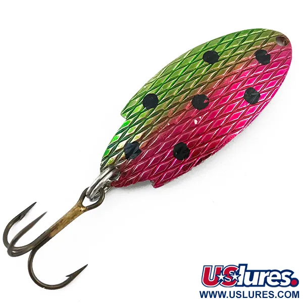 Ant poliruoto nikelio nugarėlės esantis įspaudas aiškiai identifikuoja šį masalą kaip Thomas Buoyant T101 – klasikinio JAV dizaino pavyzdį. 4 cm (1 1/2") ilgio ir 5 g (3/16 oz) svorio vartiklė pasižymi išskirtiniu rombo formos raštu išmuštu paviršiumi, kuris sukuria tikrovišką žvynų efektą. Šis konkretus modelis, žymimas prekės kodu 5006, yra Rainbow Trout spalvos su būdingu perėjimu iš žalios į rožinę ir ryškiais juodais taškais. Masalas sukomplektuotas su tvirtu žiedeliu ir aštriu trišakiu kabliu, jo būklė įvertinta 5/5. Žvejai šį svorį paprastai renkasi lengvam spiningavimui upeliuose ar ežeruose, gaudant upėtakius ir ešerines žuvis. Įgaubtas metalinio korpuso profilis sukurtas taip, kad efektyviai stumtų vandenį tolygiai traukiant. Kiekviena detalė – nuo ryškių dažų iki aiškaus graviravimo nugarėlėje – atspindi Thomas Spinning Lure Company gamybos kokybės standartus.