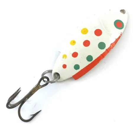 Balti dažai yra „White Trout“ spalvinės gamos pagrindas, kurį papildo raudoni, žali ir geltoni taškeliai ant 4 cm ilgio korpuso. Kitoje šios JAV pagamintos blizgės pusėje yra ryškiai geltona apdaila, kurioje į metalą aiškiai įspaustas „Thomas“ prekės ženklas ir „Buoyant“ modelio pavadinimas. 5 g sverianti masalas pasižymi ryškia oranžine-raudona juostele išilgai apatinio išlinkimo, suteikiančia papildomą vizualinį kontrastą. Tiek dažyti paviršiai, tiek furnitūra yra išskirtinai gerai išsilaikę, todėl būklė įvertinta 5/5. Produktų kataloge nurodytas kodas 5358, šis egzempliorius turi originalų tamsios apdailos trišakį kabliuką ir tvirtą metalinį žiedelį.