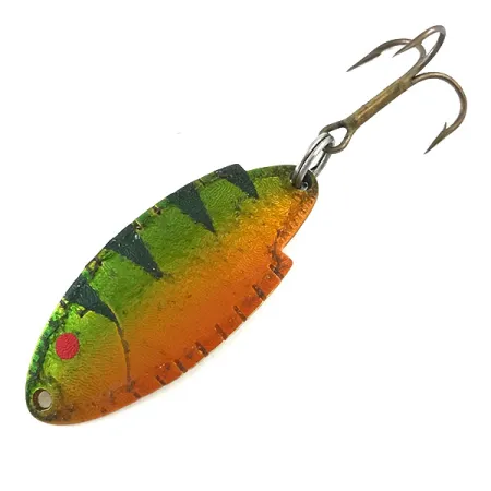 Ši 5 g (3/16 oz) svorio blizgė pasižymi klasikinės šaukštelio formos dizainu, dėl kurio Thomas masalai dešimtmečius yra nepakeičiami upėtakių žvejyboje. Ryški Fire Tiger spalva padengta ant tekstūruoto priekinio paviršiaus, pereinanti iš žalios į oranžinę su ryškiais vertikaliais dryžiais ir viena raudona akimi. Kita pusė yra poliruoto aukso spalvos, su aiškiai įspaustu Thomas prekės ženklu, Buoyant modelio pavadinimu ir T101 žymėjimu. 4 cm (1 1/2") ilgio profilis tiksliai imituoja mažą žuvelę, todėl tai universalus pasirinkimas spiningavimui upeliuose ar ežeruose. Ši JAV pagaminta blizgė (produkto kodas 5359) yra 5/5 būklės, o furnitūra bei žiedeliai atrodo puikiai išlaikyti. Geometrija pasižymi šiek tiek išgaubtu korpusu, skirtu metimams ir traukimui įvairiuose gėlo vandens telkiniuose.