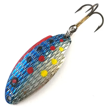 Ši JAV pagaminta vartiklė pasižymi išskirtine deimantinio rašto žvynelių tekstūra ir yra padengta ryškiomis Hammered Nickel / Blue Trout spalvomis. Sverdama 3/16oz (5g) ir būdama 1 1/2" (4cm) ilgio, ji demonstruoja klasikinį Thomas prekės ženklui būdingą meistriškumą. Priekinėje dalyje matomas ryškus perėjimas iš mėlynos į sidabrinę spalvą, papuoštas juodais, raudonais ir geltonais taškeliais, o kitoje pusėje giliai įspaustas užrašas „THOMAS BUOYANT“ bei nurodytas svoris. Furnitūra, įskaitant originalų trišakį kabliuką ir žiedelį, yra itin švari, todėl šis egzempliorius įvertintas 5/5 būkle. Šis konkretus masalas kataloguojamas prekės kodu 5416.