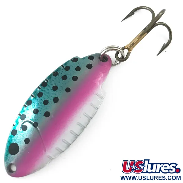 Ant šios 1 1/2" (4 cm) blizgės poliruoto nikelio nugarėlės yra aiškiai įspaustas 3/16 oz (5 g) svorio žymėjimas. Ši Thomas Buoyant blizgė, identifikuojama pagal prekės kodą 5544, pasižymi klasikine Upėtakis / Nikelis spalvinė gama su metalo žalsvumo viršutine dalimi ir sodriai rožine šonine linija, papuošta ryškiais juodais taškeliais. Štampuotas metalinis korpusas turi būdingas įpjovas šonuose – tai dizaino elementas, tapęs prekės ženklo gamybos JAV istorijos simboliu. Aštrus, bronzinis trišakis kabliukas pritvirtintas sidabriniu žiedeliu gale. Atsižvelgiant į 5/5 būklės įvertinimą, masalas pasižymi neįtikėtinai gerai išlaikyta apdaila, o įspaustas tekstas „THOMAS 3/16 OZ BUOYANT“ išlieka aiškus ir įskaitomas atspindinčiame nikelio paviršiuje.