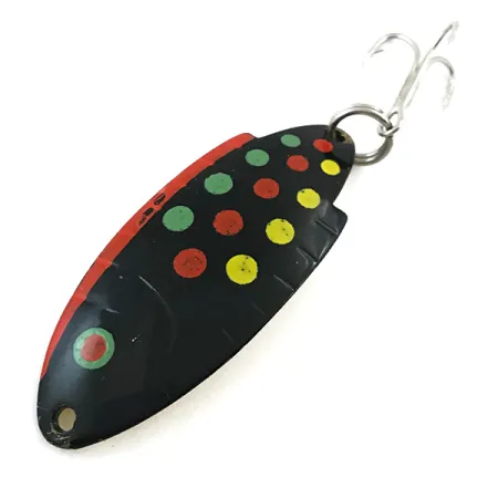 Geltonai dažytoje apatinėje dalyje įspaustas pavadinimas „THOMAS BUOYANT“ išlieka ryškus ir įskaitomas ant šios 1 3/4 colio (4,5 cm) metalinės blizgės. Šis konkretus egzempliorius, pažymėtas prekės kodu 5545, pasižymi ikonišku „Black Trout“ raštu – tamsiu paviršiumi, papuoštu ritmiška žalių, raudonų ir geltonų taškelių seka. 1/4 oz (7 g) sverianti blizgė yra išskirtinės būklės (įvertinta 5/5), jos paviršius švarus, o dažai puikiai išsilaikę. Konstrukcijai būdingas nedidelis asimetrinis išlinkimas ir šoninio peleko detalė, sukurianti specifinį profilį vandenyje – tai firminis JAV pagamintų „Thomas“ bendrovės masalų dizainas. Įrangą sudaro tvirtas žiedelis gale, prie kurio pritvirtintas ryškus sidabrinis trišakis kabliukas, o viena anga priekyje tarnauja kaip tvirtinimo taškas mėtymui ar velkiavimui.