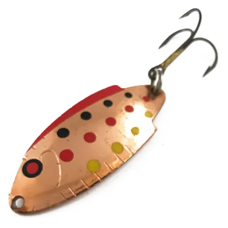 Galinėje pusėje į metalą aiškiai iškaltas „Thomas Buoyant“ pavadinimas puikuojasi greta 1/4oz (7g) svorio žymos ir modelio numerio T102. Ši klasikinė blisgė, identifikuojama pagal prekės kodą 5546, yra 1 3/4" (4,5 cm) ilgio ir pasižymi kolekcininkų vertinama aukšto blizgesio vario apdaila. Priekinė dalis dekoruota juodų, geltonų ir raudonų taškų seka, kurią papildo ryškiai raudona juosta viršutinėje briaunoje ir didelė taikinio stiliaus akis priekyje. 5/5 būklės masalas išlaikęs originalų švytėjimą ir ryškias dažų linijas tiek lygiose, tiek tekstūruotose vietose. Konstrukcijos kokybė atspindi JAV kilmę: naudojamas tvirtas žiedelis ir standartinis trišakis kabliukas. Smulkūs vertikalūs įspaudai apatinėje plokštelės briaunoje sukuria subtilią žvynų tekstūrą, kuri šviesą atspindi kitaip nei likęs korpusas.